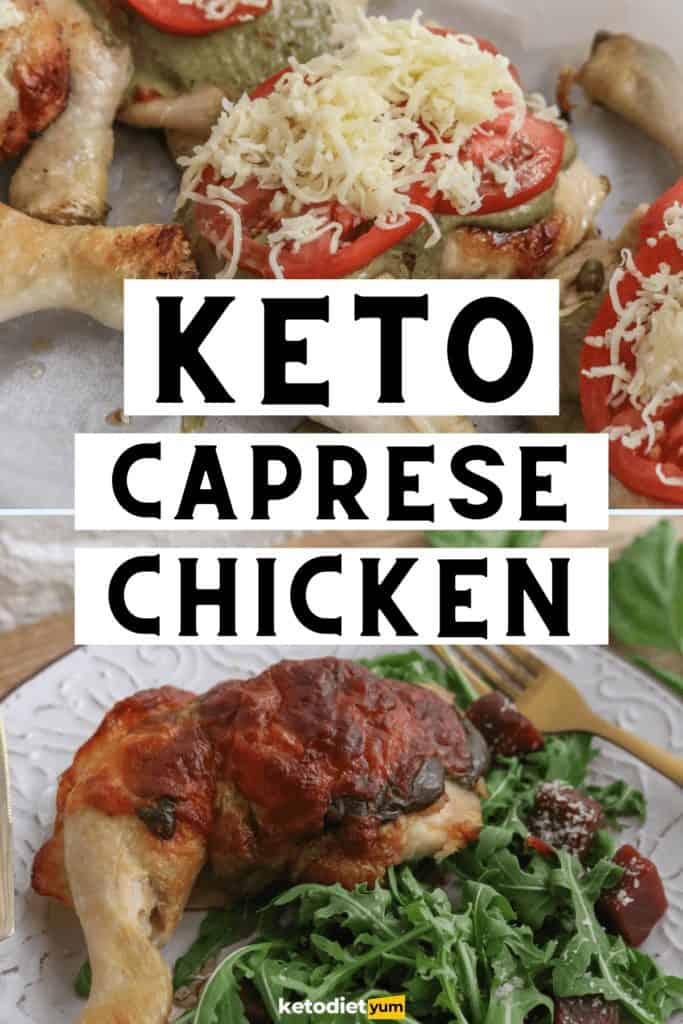 Keto Caprese Chicken cooked perfectly with juicy slices of tomato, sunflower seed infused basil pesto and golden melted mozzarella!