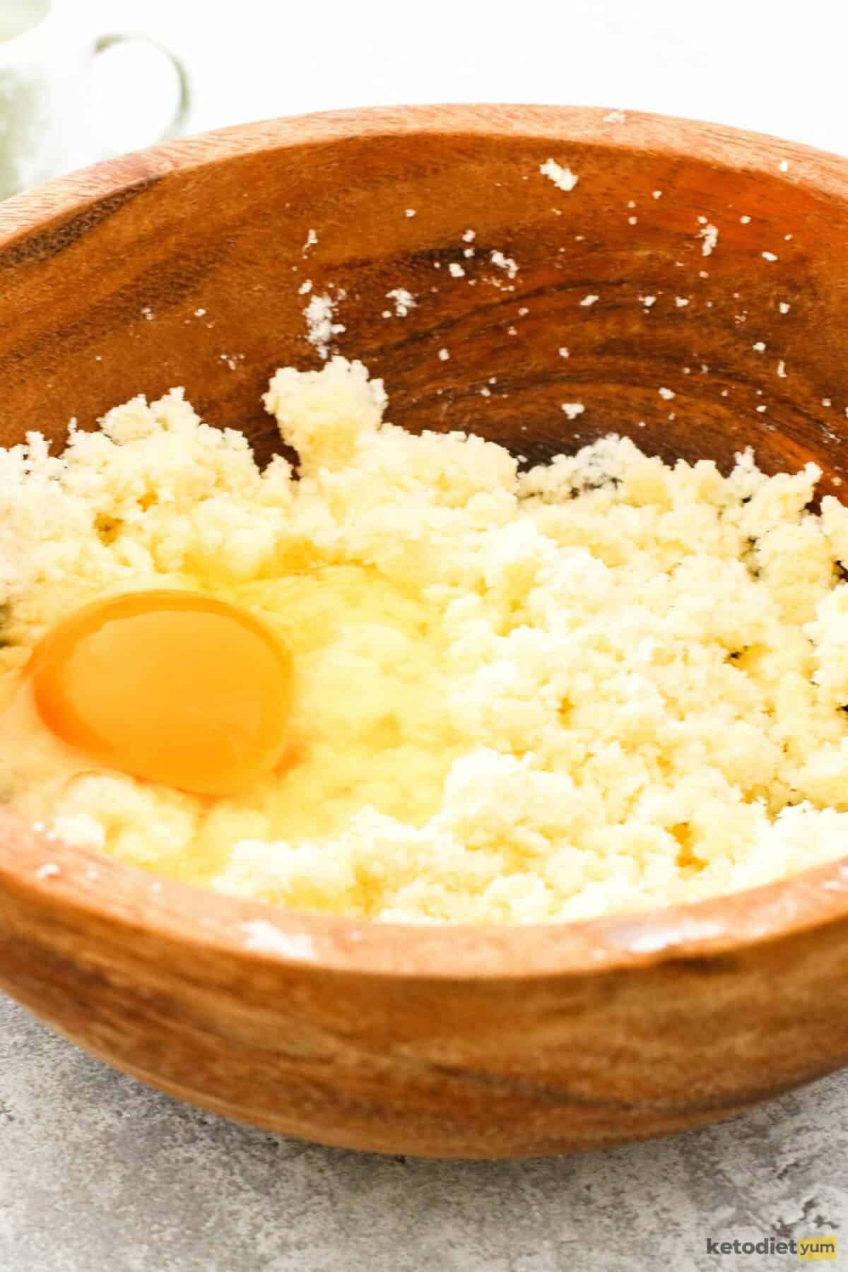 - Add in the egg and mix to incorporate into a crumbly dough.