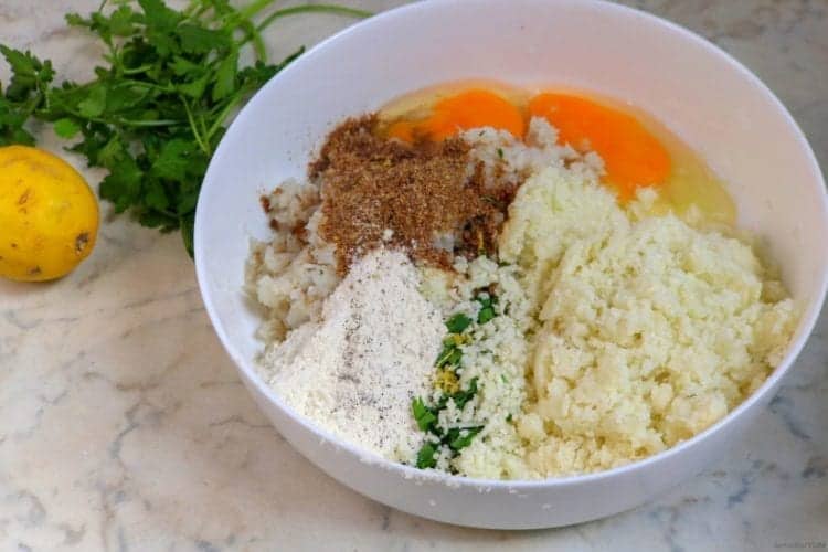 - In a large mixing bowl combine the cauliflower with the fish, eggs, almond flour, flaxseed, lemon zest, parsley, salt and pepper.